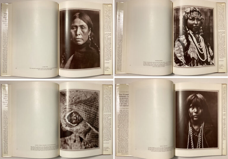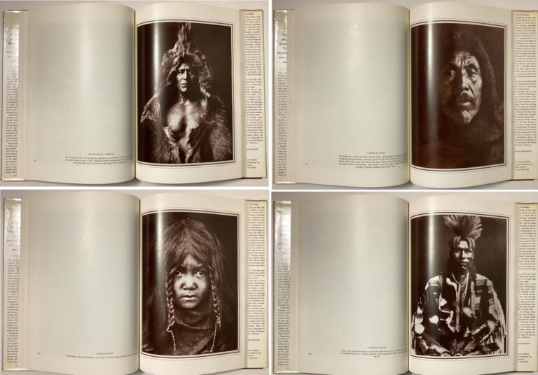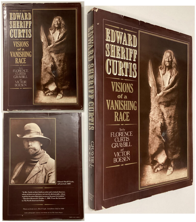 Edward Sheriff Curtis: Visions of a Vanishing Race by Florence Curtis Graybill and Victor Boesen (text), Edward S. Curtis (photographs) 1981 Hardcover in dustjacket, an illustrated book of photographic art with biography and memoir. From 1904 to 1930, Edward Curtis dedicated his life to documenting with pen and camera the faces and culture of over 80 tribes in North America. This is a compilation of 175 magnificent photographs, many of them reproduced for the first time and made directly from Curtis’ own glass-plate negatives and original plates and selected by his daughter, Florence, who collaborated with Victor Boesen to give a detailed biography of Curtis’s life and work. The book also includes a memoir of Curtis by his son, Harold. Title: Edward Sheriff Curtis: Visions of a Vanishing Race Author: Florence Curtis Graybill, Victor Boesen (text), Edward S. Curtis (illustrations) Publisher: American Legacy Press, New York Publication Date: 1981 Edition: 1981 Edition ISBN: 0517348195 Language: English Pages: 303 pages Illustrations : Over 175 B/W and sepia-toned reproductions of photographs, many of them full-page Binding: Hardcover in illustrated dustjacket Format: Vertical, Large Condition: Fine – light 1-inch scuff on the front cover, bottom front edge; book pages show no wear Dustjacket Condition: Good – edges show wrinkling/shelfware, no tears or stains Dimensions (HxWxD): 13.25 x 9.75 x 1 inches | 33.5 x 25 x 2.5 cm Weight : 4 lb, 1 oz | 1845 grams Stock ID: CUR181bv